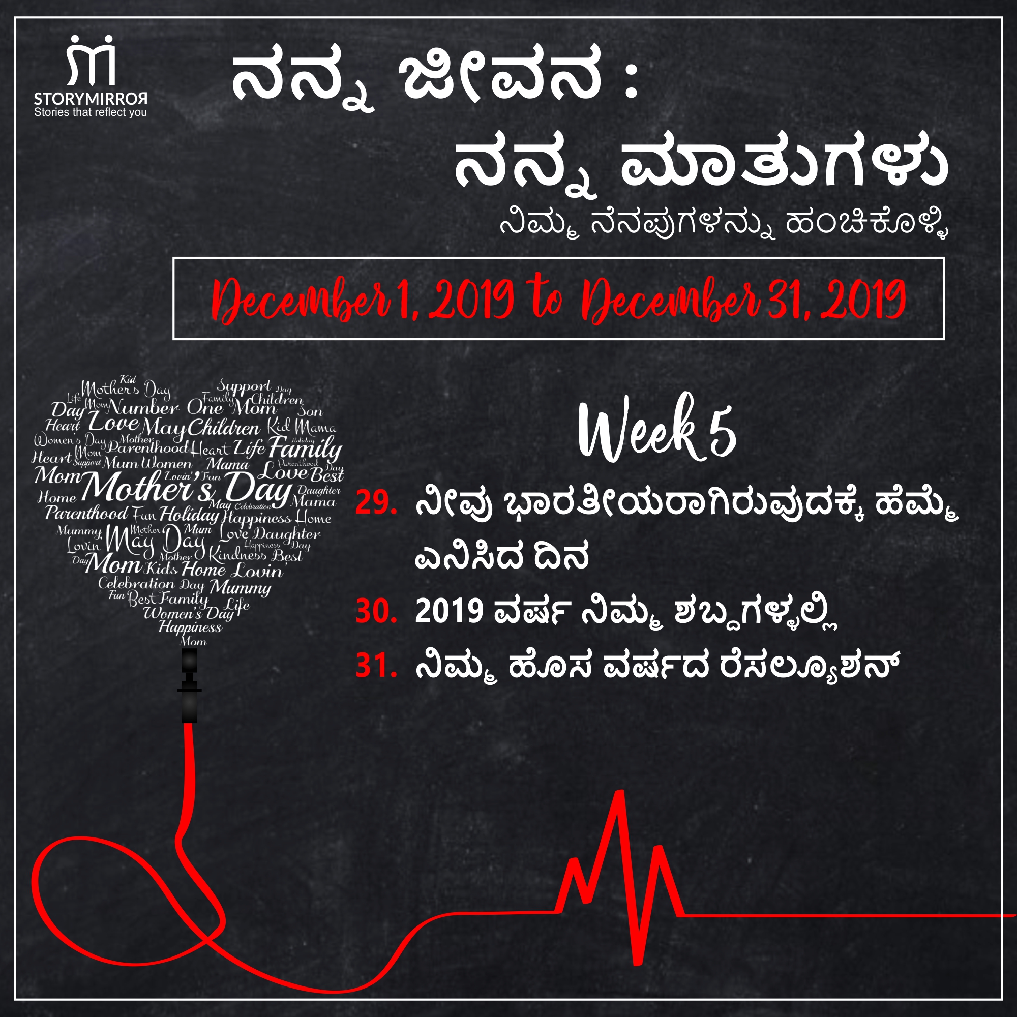 ವಿಷಯಗಳ ಪಟ್ಟಿಯನ್ನು ವಾರಕ್ಕೊಮ್ಮೆ ಹಂಚಿಕೊಳ್ಳಲಾಗುತ್ತದೆ. ಆ ವಿಷಯಗಳ ಬಗ್ಗೆ ಬರೆಯಿರಿ ಮತ್ತು ನಿಮ್ಮ ಕಥೆ / ಕವಿತೆಗಳನ್ನು ಎಲ್ಲರೊಂದಿಗೆ ಹಂಚಿಕೊಳ್ಳಿ. ನಿಮ್ಮ ಕಥೆ / ಕವಿತೆ ಎಷ್ಟು ಶಕ್ತಿಯುತವಾಗಿರಬಹುದು ಎಂದು ನಿಮಗೆ ತಿಳಿದಿಲ್ಲ.