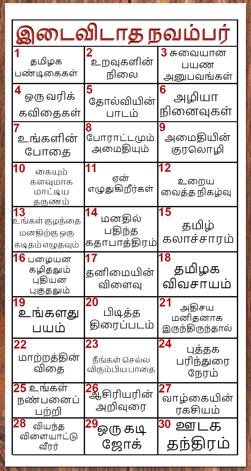 ஆம் என்றால் நீங்கள் சரியான இடத்திற்குத் தான் வந்துள்ளீர்கள்! ஸ்டோரி மிரர் உங்களுக்காக " இடைவிடாத நவம்பர் " எழுதுவதில் ஒரு மாத காலம் இடைவிடா சவால்!