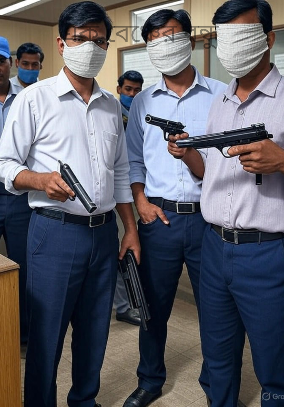 ব্যংকের দরজা বন্ধ। দারোয়ান সিংজীর মাথায় বন্দুক ধরে আছে একজন। বাকী দুজন ম্যানেজারের কাছে ভল্টের চাবি চাইছে।