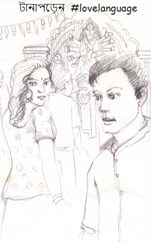 সাহেব বাগান, দক্ষিণা কালী মন্দির, ভোগী রামের চপের দোকান পার হয়ে তিন মাথার মোড়ে সিগন্যালের নীচে রাস্তার রেলিংয়ের ধারে একটু অন্ধকারে এসে রিয়া দাঁড়ালো। আমিও রিয়ার পিছন পিছন এসে থমকে দড়িয়ে পরলাম। ঠাকুর দেখতে এলাম। কিন্তু প্যান্ডেল কোথায়! এতো শুধু রাস্তায় রাস্তায় হেঁটেই চলেছি! প্রায় ঘণ্টা খানেক এক নাগাড়ে হেঁটে রিয়া হাঁপিয়ে গেছে। ওর কপালে বিন্দু বিন্দু ঘাম জমেছে। জামার উপরেও ঘামের ভেজা ভেজা ছাপ লেগেছে। রিয়া আমার মুখের দিকে ঘুরে তাকাল। যেন পাবলো পিকাসোর আঁকা জলজ্যান্ত এক ছবি মূর্তিমান হয়ে আমার সামনে দাঁড়িয়ে আছে। আমি কিছুই বলতে পারলাম না। রিয়াই প্রথম নিস্তব্ধতা ভেঙে বলল, ‘এই অনুপম আমাকে কেমন লাগছে রে!’ সেই সকাল থেকে রিয়া একই কথা জিজ্ঞেস করে চলেছে। আমি বললাম, ‘তোকে তো ভালোই লাগছে। তুই কি শুধু এই কথাটাই জিজ্ঞেস করবার জন্য আমাকে এতটা হটিয়ে আনলি!’ রিয়া বলল, ‘না না, তা মোটেই নয়। আসলে লিলি, রুপা, সোনাই এরা দেখতে পেলে ঠাট্টা করবে’। আমি বললাম, ‘কেন, ওরা ঠাট্টা করবে কেন! আর তাছাড়া ওরা আমাদের দেখতেই বা পাবে কেমন করে?’ রিয়া বলল, ‘তুই একেবারে হাঁদা। কিচ্ছু বুঝিস না। পুজোর সময় সহজে লুকানো যায় না। ঠিক কেউ না কেউ দেখে ফেলবে’। আমি বললাম, ‘দেখে ফেললেই বা হয়েছেটা কি! আমরা তো ঠাকুর দেখতে এসেছি!’ রিয়া বলল, ‘ঠিক তাই। আমরা ঠাকুর দেখতে এসেছি। সেই কারণেই বলছি’। আমার মাথায় তো কিছুই ঢুকছে না। রিয়া বলল, ‘এখন যদি ক্যাবলা আর অভি তোকে আর আমাকে এই অবস্থায় দেখে ফেলে, তাহলে কি হবে বল!’ আমি মনে মনে ক্যাবলা আর অভির কথা চিন্তা করলাম। ক্যাবলার কথা না হয় ছেরেই দিলাম। ও তো সত্যি সত্যিই ক্যাবলা। কিন্তু অভিটা বড্ড ফাজিল। রিয়াকে দেখলেই বলবে – তোকে হেব্বি লাগছে রে রিয়া! কেমন গায়ে পড়া যেন অভিটা। রিয়া বলল, ‘কি হল, চুপ করে আছিস যে! কিছু বল!’ কি বলব আমি! আমার তো কোনও কথাই মনে আসছে না। এরকম সিচ্যুয়েশানে আগে কখনও পড়িনি। চার পাশে কেউ সেরকম নেই। রাস্তার উপর দিয়ে হুস হুস করে গাড়ি যাচ্ছে। এদিকটায় ব্লাইন্ড স্ট্রীট। কোনও ঠাকুর নেই। তাই ভিড়ও সেরকম নেই। রিয়া আমার হাত দুটোকে খপ করে ধরল। আমি আবার শিউড়ে উঠলাম। আমার গায়ে কাঁটা দিয়ে উঠল। রিয়া আমাকে ফিস ফিস করে বলল, ‘এই অপূ, আমাকে তোর কেমন লাগে রে!’। রিয়ার হাত দুটো কাঁপছে। আমি স্পষ্ট অনুভব করতে পারছি। ঘন ঘন দীর্ঘশ্বাস পড়ছে ওর। আমি রিয়ার চোখের দিকে তাকালাম। রিয়া আমাকে কখনও অপূ বলে ডাকে না। আজ ডাকল। ওর চোখ দুটো যেন জ্বলছে। আমি কিছু উত্তর দিতে পারলাম না। রিয়া আবার আমার হাত দুটোকে ঝাঁকিয়ে জিজ্ঞেস করল, ‘বল না অপূ, আমাকে তোর কেমন লাগে?’ আমি বললাম, ‘ভালো!’ রিয়া বলল, ‘শুধু ভালো! আর কিছু না!’ আমি বললাম, ‘খুব ভাল!’ রিয়া আবার বলল, ‘খুব ভা