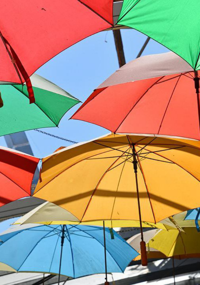 With umbrellas.