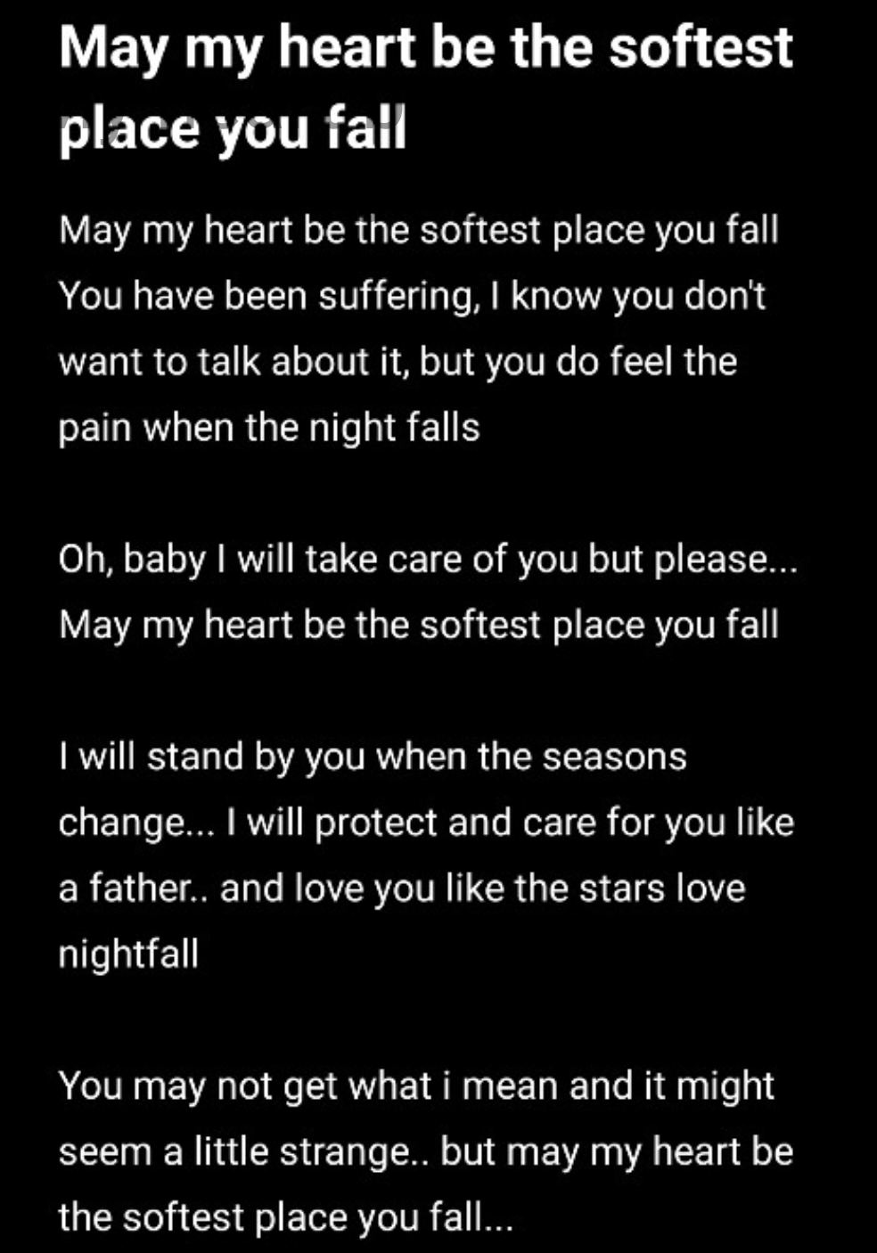 You may not get what I mean and it might seem a little strange.. but may my heart be the softest place you fall...