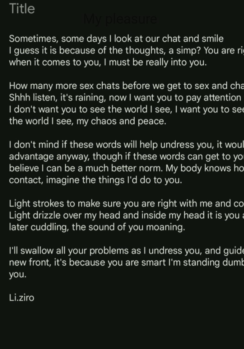 I don't mind if these words will help undress you, it would be to my advantage anyway, though if these words can get to you I want to believe I can be a much better norm. My body knows how to keep contact, imagine the things I'd do to you.