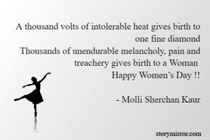 A thousand volts of intolerable heat gives birth to one fine diamond Thousands of unendurable melancholy, pain and treachery gives birth to a Woman Happy Women’s Day !! - Molli Sherchan Kaur