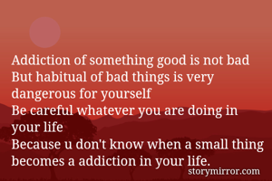 Addiction of something good is not bad But habitual of bad things is very dangerous for yourself Be careful whatever you are doing in your life Because u don't know when a small thing becomes a addiction in your life.