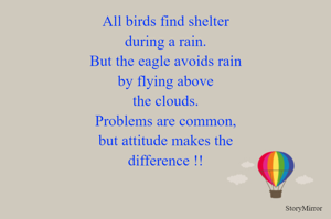 All birds find shelter during a rain. But the eagle avoids rain by flying above the clouds. Problems are common, but attitude makes the difference !!