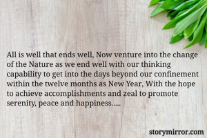 All is well that ends well, Now venture into the change of the Nature as we end well with our thinking capability to get into the days beyond our confinement within the twelve months as New Year, With the hope to achieve accomplishments and zeal to promote serenity, peace and happiness.....