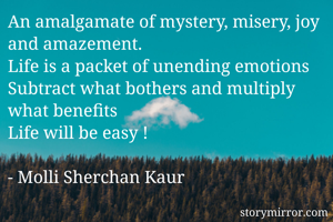 An amalgamate of mystery, misery, joy and amazement. Life is a packet of unending emotions Subtract what bothers and multiply what benefits Life will be easy ! - Molli Sherchan Kaur