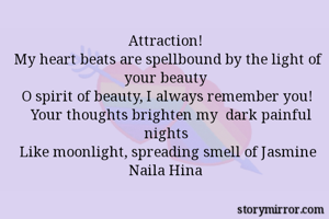 Attraction! My heart beats are spellbound by the light of your beauty O spirit of beauty, I always remember you! Your thoughts brighten my dark painful nights Like moonlight, spreading smell of Jasmine Naila Hina