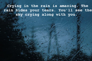 Crying in the rain is amazing. The rain hides your tears. You'll see the sky crying along with you.