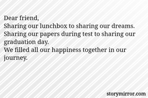 Dear friend, Sharing our lunchbox to sharing our dreams. Sharing our papers during test to sharing our graduation day. We filled all our happiness together in our journey.