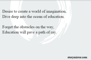 Desire to create a world of imagination, Dive deep into the ocean of education. Forget the obstacles on the way, Education will pave a path of ray.