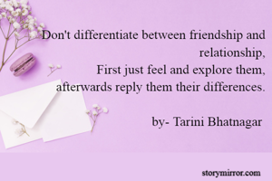 Don't differentiate between friendship and relationship, First just feel and explore them, afterwards reply them their differences. by- Tarini Bhatnagar