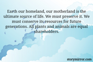 Earth our homeland, our motherland is the ultimate source of life. We must preserve it. We must conserve its resources for future generations. All plants and animals are equal shareholders.