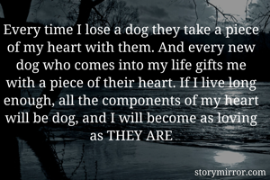Every time I lose a dog they take a piece of my heart with them. And every new dog who comes into my life gifts me with a piece of their heart. If I live long enough, all the components of my heart will be dog, and I will become as loving as THEY ARE