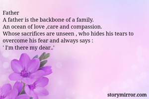Father A father is the backbone of a family. An ocean of love ,care and compassion. Whose sacrifices are unseen , who hides his tears to overcome his fear and always says : ' I'm there my dear..'