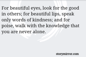 For beautiful eyes, look for the good in others; for beautiful lips, speak only words of kindness; and for poise, walk with the knowledge that you are never alone.