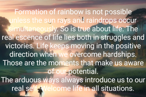 Formation of rainbow is not possible unless the sun rays and raindrops occur simultaneously. So is true about life. The real escence of life lies both in struggles and victories. Life keeps moving in the positive direction when we overcome hardships. Those are the moments that make us aware of our potential.
