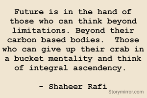 Future is in the hand of those who can think beyond limitations. Beyond their carbon based bodies. Those who can give up their crab in a bucket mentality and think of integral ascendency. - Shaheer Rafi