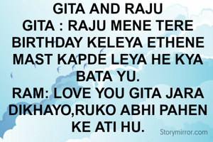 GITA AND RAJU GITA : RAJU MENE TERE BIRTHDAY KELEYA ETHENE MAST KAPDE LEYA HE KYA BATA YU. RAM: LOVE YOU GITA JARA DIKHAYO,RUKO ABHI PAHEN KE ATI HU.