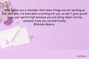 God quotes are a reminder that when things are not working as per your plan, his best plan is working for you, so don't give up and keep your spirits high because you are being taken care by someone loves you unconditionally. @Shikha Mishra