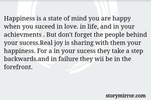 Happiness is a state of mind you are happy when you suceed in love. in life, and in your achievments . But don't forget the people behind your sucess.Real joy is sharing with them your happiness. For a in your sucess they take a step backwards.and in failure they wii be in the forefront.