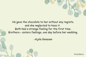 He gave the chocolate to her without any regrets. and she neglected to have it . Both had a strange feeling for the first time. Brothers - sisters feelings, one day before her wedding. -Ajola Ganesan