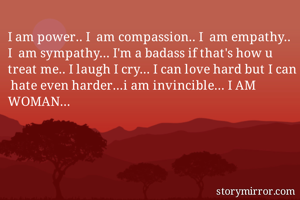 I am power.. I am compassion.. I am empathy.. I am sympathy... I'm a badass if that's how u treat me.. I laugh I cry... I can love hard but I can hate even harder...i am invincible... I AM WOMAN...
