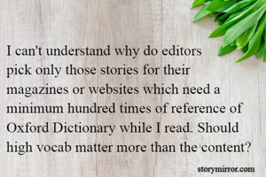 I can't understand why do editors pick only those stories for their magazines or websites which need a minimum hundred times of reference of Oxford Dictionary while I read. Should high vocab matter more than the content?