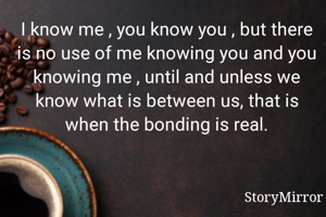 I know me , you know you , but there is no use of me knowing you and you knowing me , until and unless we know what is between us, that is when the bonding is real.