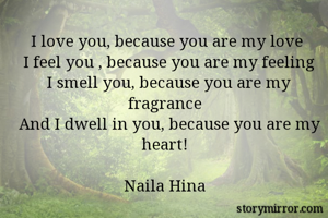I love you, because you are my love I feel you , because you are my feeling I smell you, because you are my fragrance And I dwell in you, because you are my heart! Naila Hina
