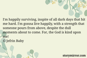 I'm happily surviving, inspite of all dark days that hit me hard. I'm gonna live happily, with a strength that someone pours from above, despite the dull moments about to come. For, the God is kind upon me!