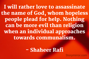 I will rather love to assassinate the name of God, whom hopeless people plead for help. Nothing can be more evil than religion when an individual approaches towards communalism. - Shaheer Rafi