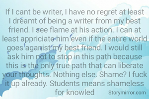 If I cant be writer, I have no regret at least I dreamt of being a writer from my best friend. I see flame at his action. I can at least appriciate him even if the entire world goes aganist my best friend. I would still ask him not to stop in this path because this is the only true path that can liberate your thoughts. Nothing else. Shame? I fuck it up already. Students means shameless for knowled