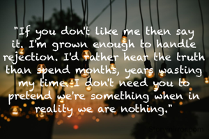 "If you don't like me then say it. I'm grown enough to handle rejection. I'd rather hear the truth than spend months, years wasting my time. I don't need you to pretend we're something when in reality we are nothing."