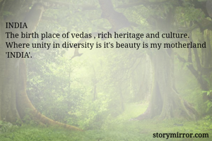 The birth place of vedas , rich heritage and culture. Where unity in diversity is it's beauty is my motherland 'INDIA'.