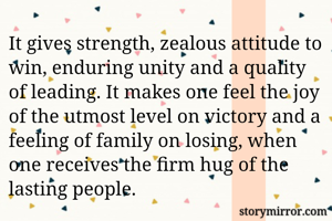 It gives strength, zealous attitude to win, enduring unity and a quality of leading. It makes one feel the joy of the utmost level on victory and a feeling of family on losing, when one receives the firm hug of the lasting people.