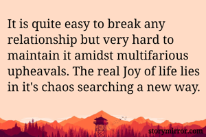 It is quite easy to break any relationship but very hard to maintain it amidst multifarious upheavals. The real Joy of life lies in it's chaos searching a new way.