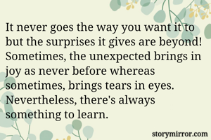 It never goes the way you want it to but the surprises it gives are beyond! Sometimes, the unexpected brings in joy as never before whereas sometimes, brings tears in eyes. Nevertheless, there's always something to learn.