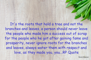 It's the roots that hold a tree and not the branches and leaves, a person should never leave the people who made him a success out of scrap for the people who he got after gaining fame and prosperity, never ignore roots for the branches and leaves, always water them with respect and love, as they made you, you...RP Quote