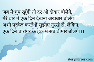 जब मैं चुप रहूँगी तो दर ओ दीवार बोलेंगे, मेरे बारे में एक दिन देखना अखबार बोलेंगे। अभी परहेज़ करते हैं सुझाए नुस्खे से, लेकिन, एक दिन चारागर के हक़ में सब बीमार बोलेंगे।।।