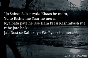 "Jo Sabse, Sabse zyda Khaas he mera, Yu to Rishte me Yaar he mera, Kya bata pate he Use Ham ki isi Kashmkash me rahe jate he ki, Jab Dost se Kahi zdya Wo Pyaar he mera.!"