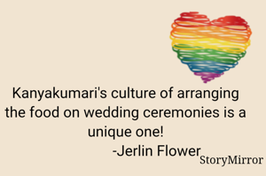 Kanyakumari's culture of arranging the food on wedding ceremonies is a unique one! -Jerlin Flower