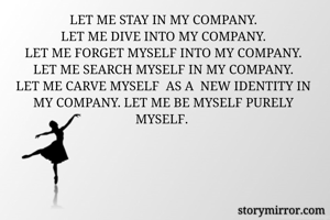 LET ME STAY IN MY COMPANY. LET ME DIVE INTO MY COMPANY. LET ME FORGET MYSELF INTO MY COMPANY. LET ME SEARCH MYSELF IN MY COMPANY. LET ME CARVE MYSELF AS A NEW IDENTITY IN MY COMPANY. LET ME BE MYSELF PURELY MYSELF.