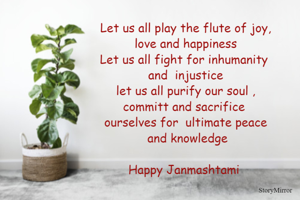 Let us all play the flute of joy, love and happiness Let us all fight for inhumanity and injustice let us all purify our soul , committ and sacrifice ourselves for ultimate peace and knowledge Happy Janmashtami
