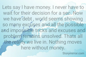 Lets say I have money. I never have to wait for their decision for a sec. Now we have debt , world seems showing so many excuses and all the possible and impossible tricks and excuses and problem remains unsolved. Thats all the reality we live in. Nothing moves here without money.