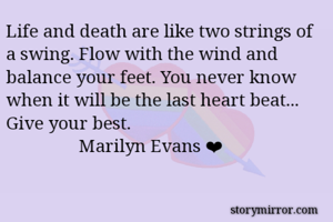 Life and death are like two strings of a swing. Flow with the wind and balance your feet. You never know when it will be the last heart beat... Give your best. Marilyn Evans ❤