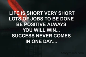 LIFE IS SHORT VERY SHORT LOTS OF JOBS TO BE DONE BE POSITIVE ALWAYS YOU WILL WIN... SUCCESS NEVER COMES IN ONE DAY....