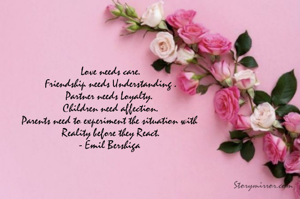 Love needs care. Friendship needs Understanding . Partner needs Loyalty. Children need affection. Parents need to experiment the situation with Reality before they React. - Emil Bershiga