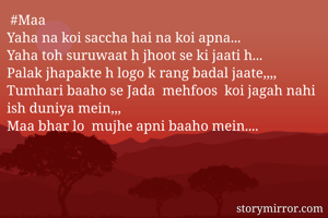 #Maa Yaha na koi saccha hai na koi apna... Yaha toh suruwaat h jhoot se ki jaati h... Palak jhapakte h logo k rang badal jaate,,,, Tumhari baaho se Jada mehfoos koi jagah nahi ish duniya mein,,, Maa bhar lo mujhe apni baaho mein....